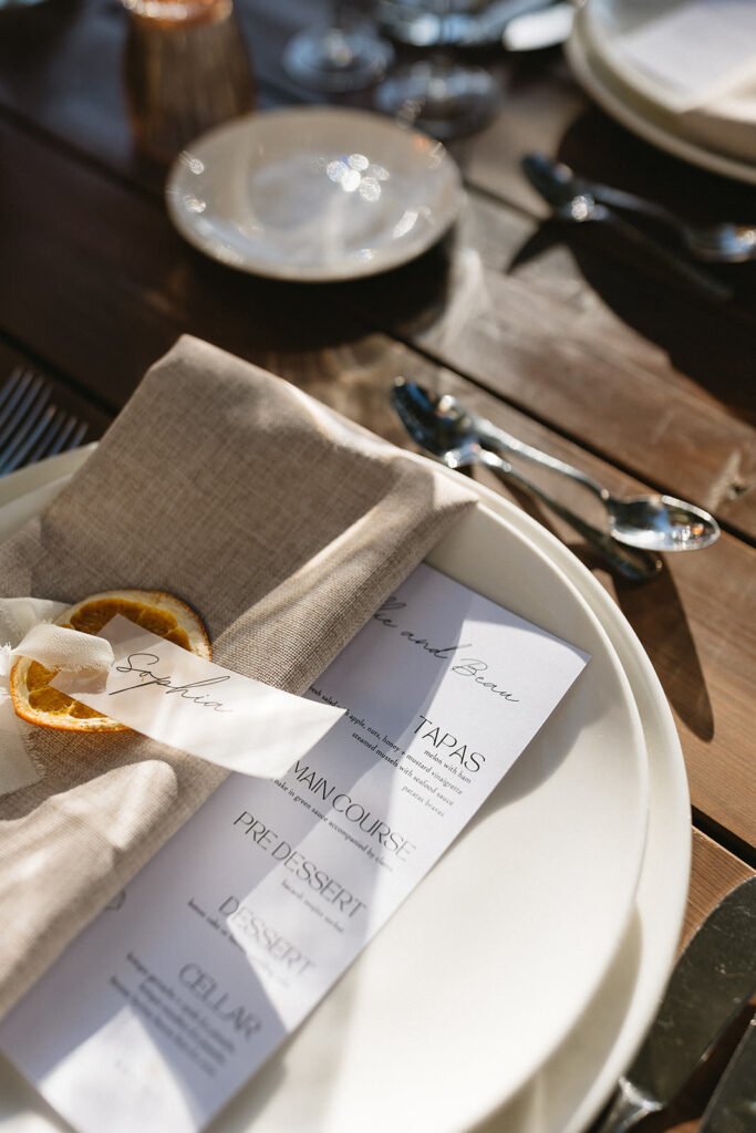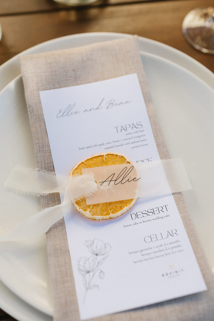 To highlight the countryside and organic theme, each guest’s seat was marked with a dried orange with a raw silk ribbon as a place name tag. Cute detail!