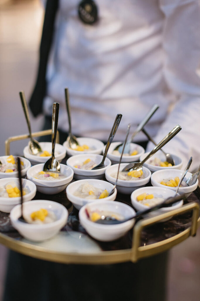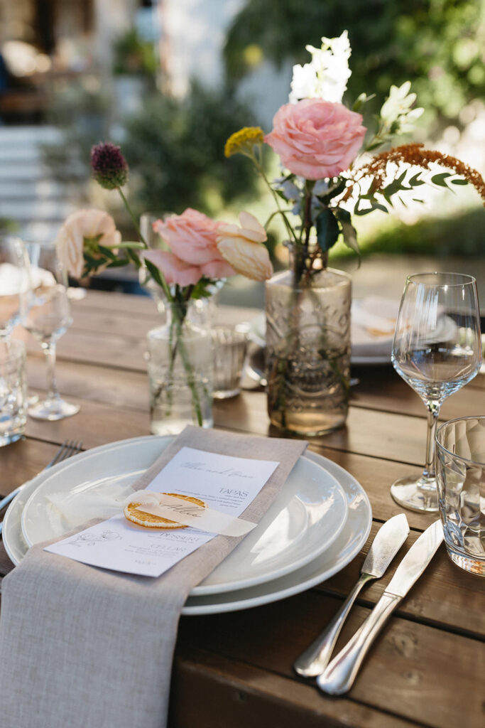 The tables were dressed up with colored, fresh and local flowers. All in delicatessen and following a palette of colors of different tones of pink, purple, orange and off-white