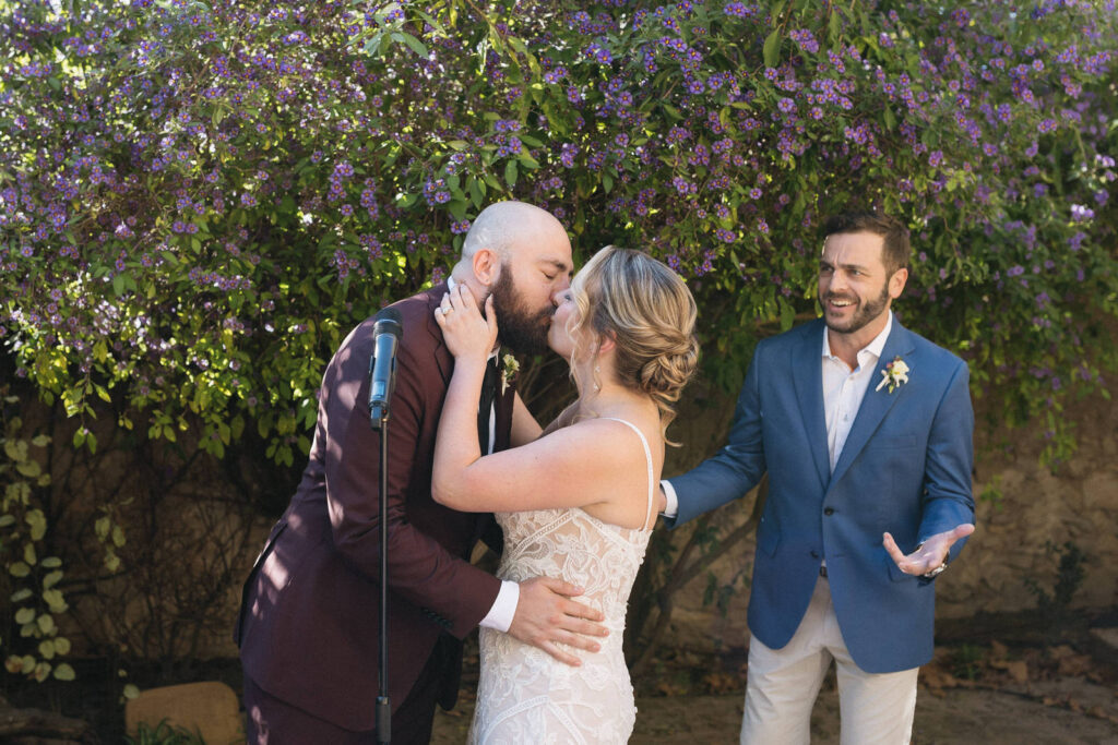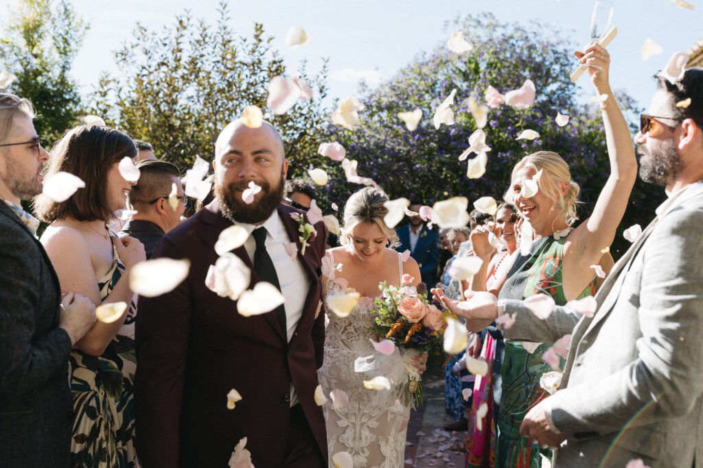 They choose the picturesque patio of the venue to setup the ceremony. This backyard was all greenery, and trees with flowers. Perfect for a simple yet organic and intimate ceremony. And what a better way to celebrate it with tossing some rose petals at the end of the ceremony?